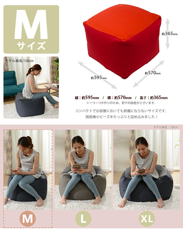 ●商品詳細 -infomation- 商品名 QUBE Mサイズ【キューブM】 サイズ 本体サイズ:約 幅44〜59.5x奥行40〜57x高さ最大36.5cm 材 質 中材:発泡ポリスチレンビーズ 収縮する生地:ポリエステル 88%/ポリウレタン 12% 収縮しない生地:ポリエステル 100% カラー ベージュ レッド アッシュグレー インディゴブルー グリーン ライトブルー ブラックグレー 重 量耐荷重 【重量】 約2.8kg 【梱包重量】 約3.8kg 梱包サイズ 約 44x40x48cm 生産国 日本製 備 考 ※他商品との同梱は出来かねます。