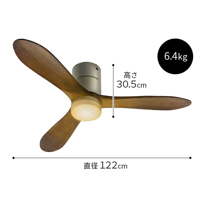 サイズ 約 1220 x 1220 x 305 /mm 羽根径 約 48インチ(122cm) 重量 約 6400g 材質 本体:スチール、羽根:桐、シェード:ガラス 電源 AC100V 50/60Hz 消費電力/電気代 モーター:35W / 1時間あたり:約 0.9円(※全国の電気代平均1kw=27円で算出) LED電灯:20W / 1時間あたり:約 0.54円(※全国の電気代平均1kw=27円で算出) 回転速度/方向 3段階(弱、中、強)/ 右回転、左回転 エネルギー消費効率 140.1lm/W 全光束 2808lm(ルーメン) 調光切替/色温度 4段階(100%・70%・50%・30%)/ 3000K 操作範囲 8m(直線距離) セット内容 本体、羽根×3、LEDライトキット、シェード、バランサーキット、取付金具、リモコン、取付ネジ一式、説明書(保証書付) ※リモコン用の単4電池×2本は付属しておりません。